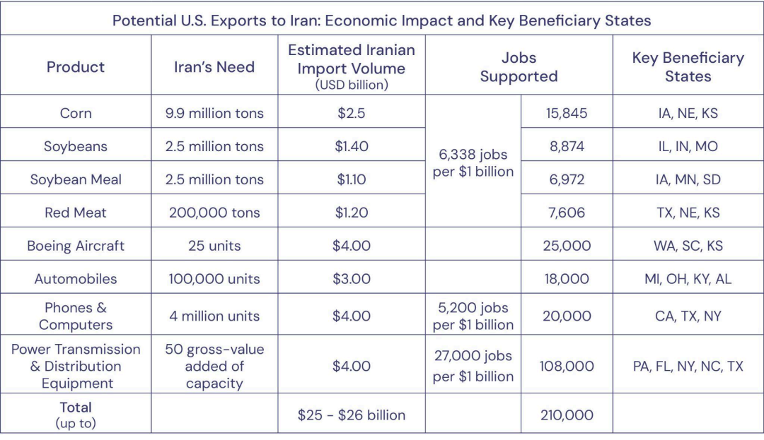 作為中東地區最大的未開發市場,伊朗能夠為美國經濟提供極其豐富的經濟機遇。與美國利益羣體直接相關的行業包括航空、農業和汽車,美國官方完全可以將其納入新的伊朗協議框架之內,且無需國會修改現有制裁法律。美國財政部外國資產控制辦公室可頒發新的通用許可證,授權向伊朗出售指定的美國商品。本文估算,以下民用領域的美國企業每年可向伊朗出口約250億美元的產品: