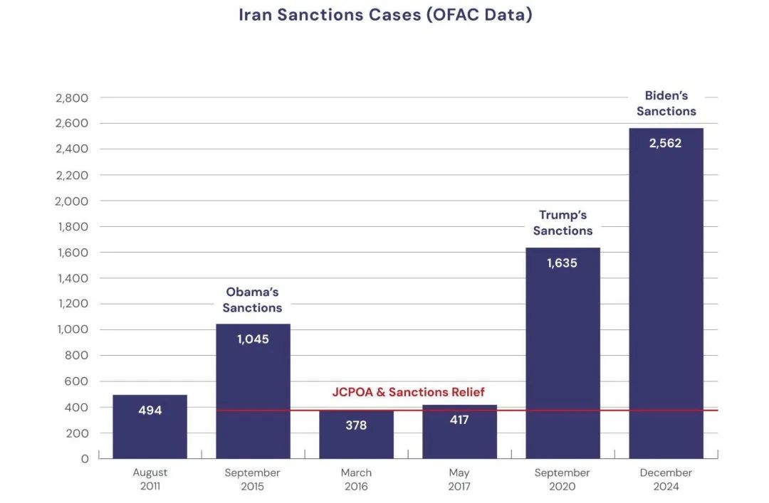 第三階段(2018年至今):2018年5月8日,美國正式退出《聯合全面行動計劃》,並恢復所有此前解除的制裁,旨在對伊朗施加“最大程度的壓力”。隨後,特朗普政府重新分類了部分制裁措施。有1139個實體和個人被新列入制裁清單,至2020年底,共有1635個實體和個人遭到制裁。特朗普總統首個任期結束後,伊朗與拜登政府曾恢復過間接對話,旨在恢復協議。但談判並未獲得成功,截至2024年12月,制裁總數升至2562項。