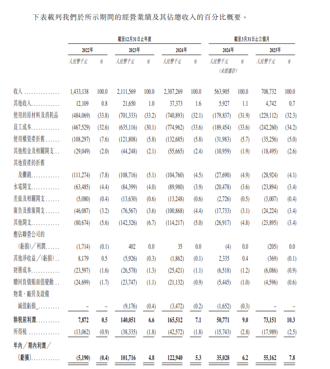 其中,2022年-2024年、2025年一季度,巴奴的原材料及消耗品分別為4.84億元、7.01億元、7.4億元和2.29億元,佔總收入的33.8%、33.2%、32.1%和32.3%。