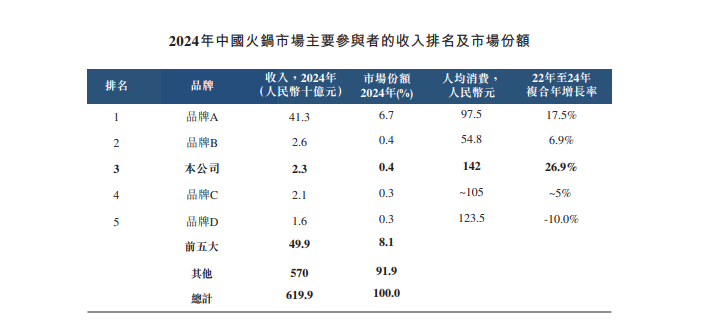 根據弗若斯特沙利文的研究報告,按照收入計算,中國火鍋市場前五大品牌所佔據的市場份額約為8.1%。