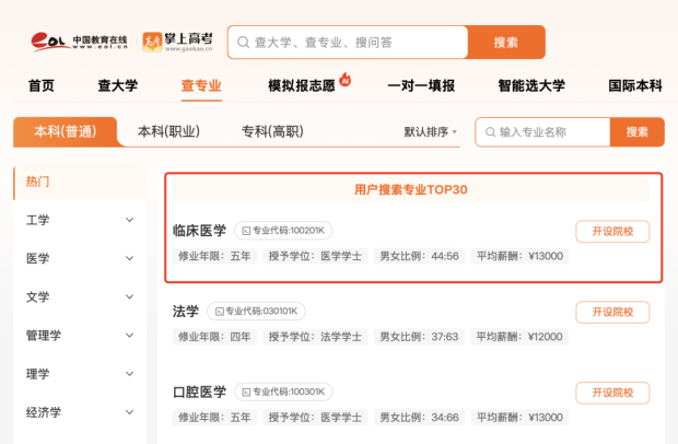 今年,“臨牀醫學”再成熱門專業之一。根據“中國教育在線”旗下網站掌上高考最新數據,“臨牀醫學”穩居今年本科(普通)“用户搜索專業TOP30”熱度榜首,口腔醫學排名第三。