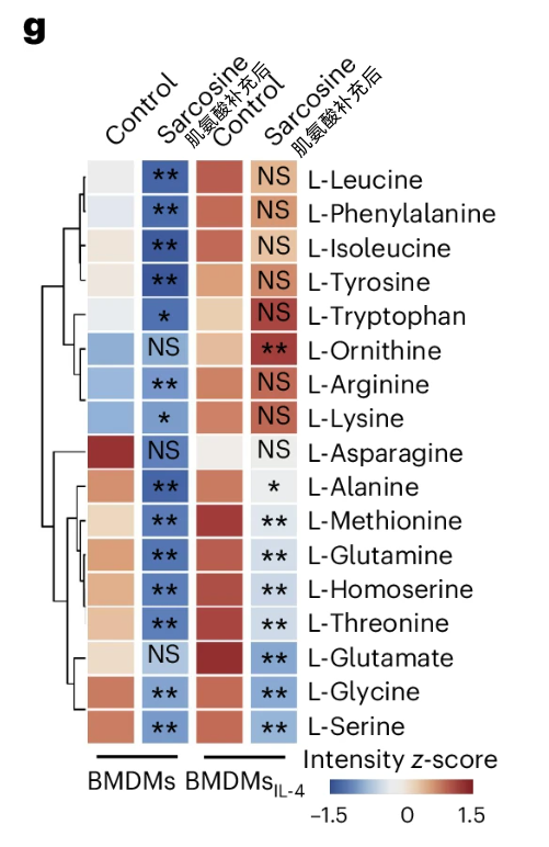 研究發現,補充肌氨酸後,巨噬細胞內的穀氨酸、蛋氨酸、甘氨酸、絲氨酸等多種氨基酸水平明顯下降,負責轉運氨基酸的轉運蛋白SLC38A2、SLC1A5也減少了,給細胞製造了一種“氨基酸飢餓”的假象。