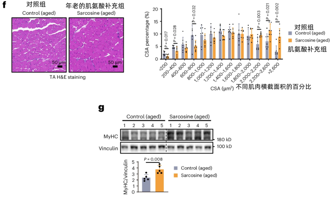 果然,在補充了肌氨酸後,老年鼠鼠的肌肉質量得到了有效維持,甚至略有回升!仔細看來,它們的肌纖維變得更粗壯、更飽滿,橫截面較大的肌纖維數量明顯增多,負責肌肉收縮的核心蛋白MyHC的表達也明顯增加了,成功抵抗了衰老帶來的肌肉流失與萎縮。