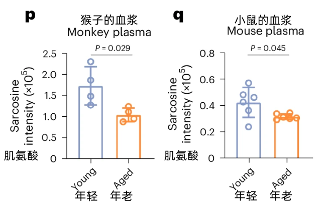 這個在人類身上的發現並非孤例。研究者又在猴子和小鼠身上進行了檢測,得到了一致的結果。不論是猴子、小鼠還是人類,肌氨酸都會隨着年齡增長、肌肉衰老流失而穩定下降。