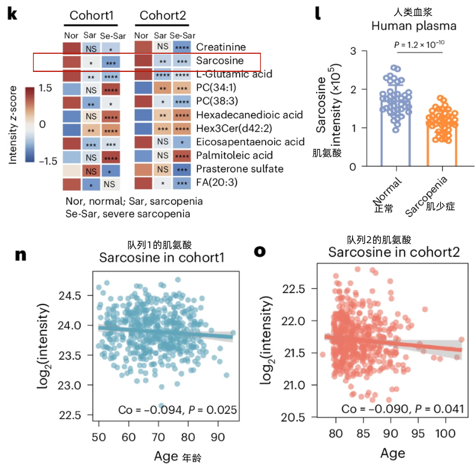結果,一個清晰的規律浮現了:在眾多代謝物中,肌氨酸的變化與肌肉衰減、衰老的關聯最為密切——年齡越大,肌氨酸水平越低,並且,肌肉流失更為嚴重的情況下(肌少症),他們體內的肌氨酸水平顯著低於肌肉正常的同齡人。