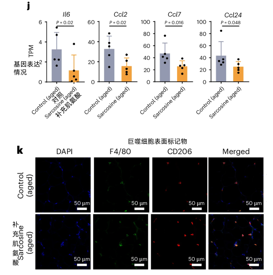 研究證實,肌氨酸果然能夠成功轉變巨噬細胞的類型。在補充肌氨酸後,小鼠內臟脂肪中的Il6、Ccl2等促炎基因紛紛下調;與此同時,抗炎型M2巨噬細胞數量則顯著增加。