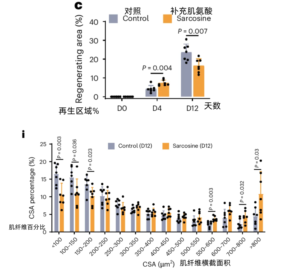 此外,補充肌氨酸還能加速肌肉的“自我修復”!研究者發現,在模擬現實生活中的肌肉拉傷後,補充過肌氨酸的小鼠的肌肉再生速度明顯快於沒有補充的小鼠。並且,它們的肌肉壞死區域迅速縮小,新生肌纖維的數量更多、更粗壯,功能恢復得也更快了!