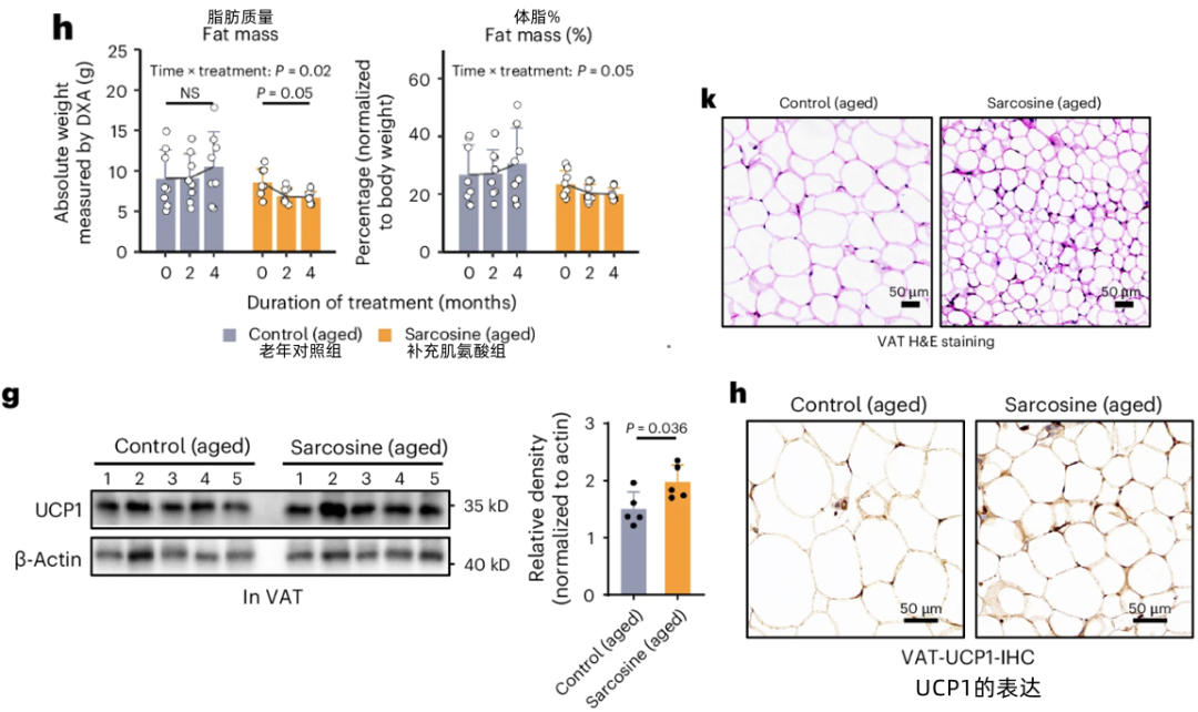 更令人驚喜的是,肌氨酸不僅能“保肌”,還能“燃脂”!研究者發現,老年小鼠在肌肉量並未減少的同時體重出現減輕,體脂率明顯下降,尤其是危害健康的內臟脂肪明顯減少!