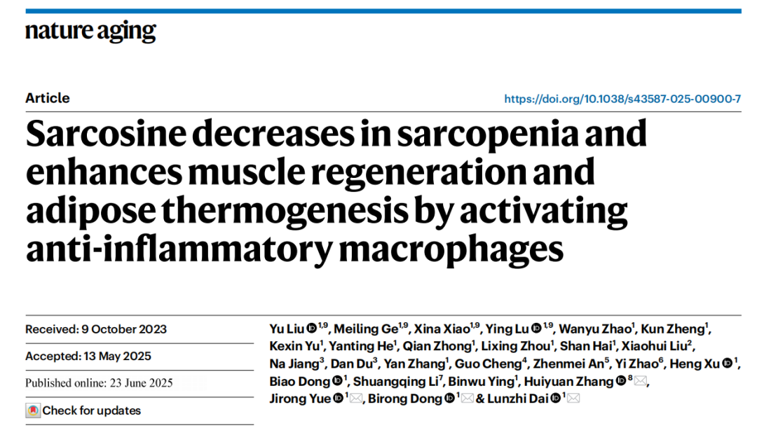 [本文的名稱是《Sarcosine decreases in sarcopenia and enhances muscle regeneration and adipose thermogenesis by activating anti-inflammatory macrophages》,發表於《Nature Aging》期刊,通訊作者是四川大學華西醫院的戴倫治、董碧蓉、嶽冀蓉、張惠媛。第一作者是Yu Liu, Meiling Ge, Xina Xiao, Ying Lu。本研究資助來源:國家自然科學基金(82073221、82401845、32301238、31870826)、四川省科技計劃項目(2024YFFK0099、2021YFS0134、2024NSFSC1601、2023NSFSC1525、2021YFS0136、2023ZYD0173)、國家老年疾病臨牀醫學研究中心(Z2024JC002)、川渝科技合作計劃(2024YFHZ0072)、華西醫院博士後基金(2023HXBH065)、華西醫院“1.3.5”學科提升計劃(ZYYC23013)。]