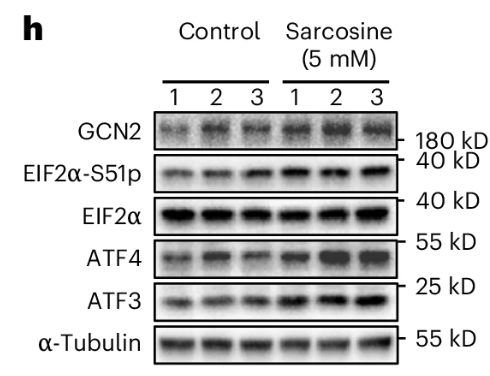 圖注:補充肌氨酸後,GCN2信號通路中的關鍵蛋白(GCN2,p-eIF2α,ATF4等)表達水平被升高