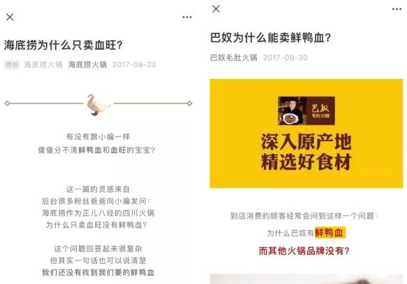 而當顧客質問海底撈“為什麼不賣鮮鴨血”的事件發酵後,巴奴更是高調發文《巴奴為什麼能賣鮮鴨血》大秀了一把技術實力。