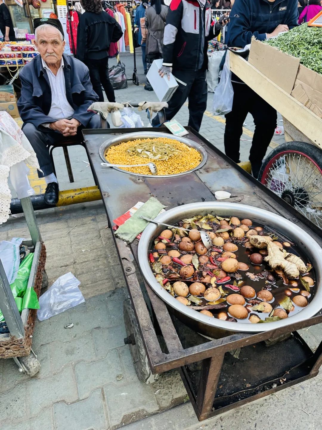 那大盆兒裏有堆積的鷹嘴豆,上面鋪蓋一層蘿蔔絲,剝了皮的熟雞蛋,青紅椒絲的點綴。還有煮熟後剝了皮的土豆,它們的組合,層次分明地擺放,讓你垂涎三尺。