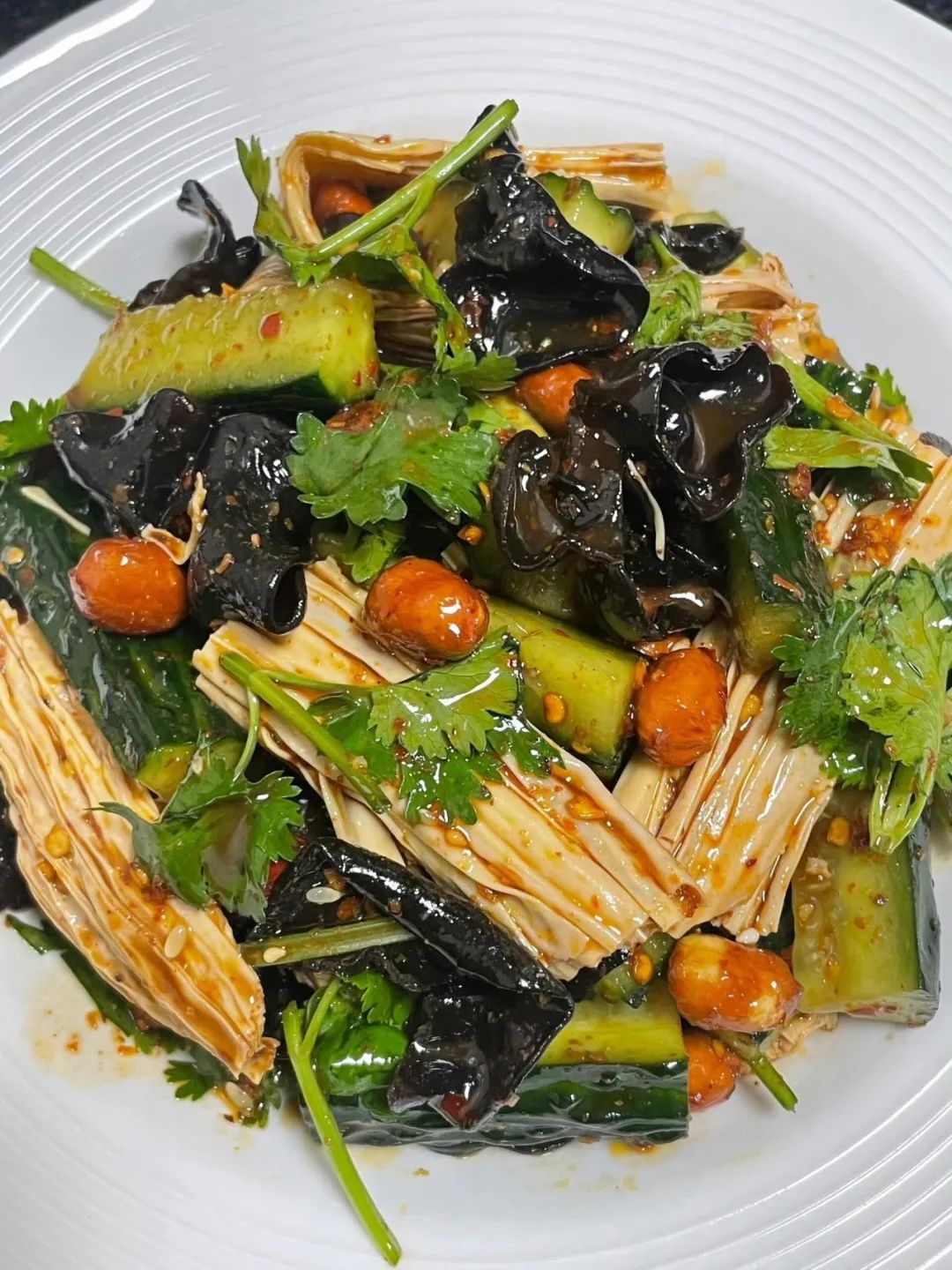 接着你可以選黃瓜、木耳、生菜在調配好的料汁裏攪拌。也可以搭配其他菜炒,葷素都可以,火鍋涮菜也有它的身影。