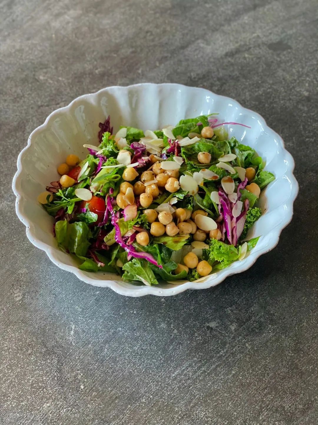 根據口味滴些許小磨香油和醋,接着將洗淨的紫洋葱,黃瓜、西紅柿切成適配的形狀。與鷹嘴豆碰撞,料汁倒進去後,開始攪拌。再拿幾根洗淨的香菜,用手指捏着輕輕一掐,葉片的飄落,點點綠意,也散發辛香。