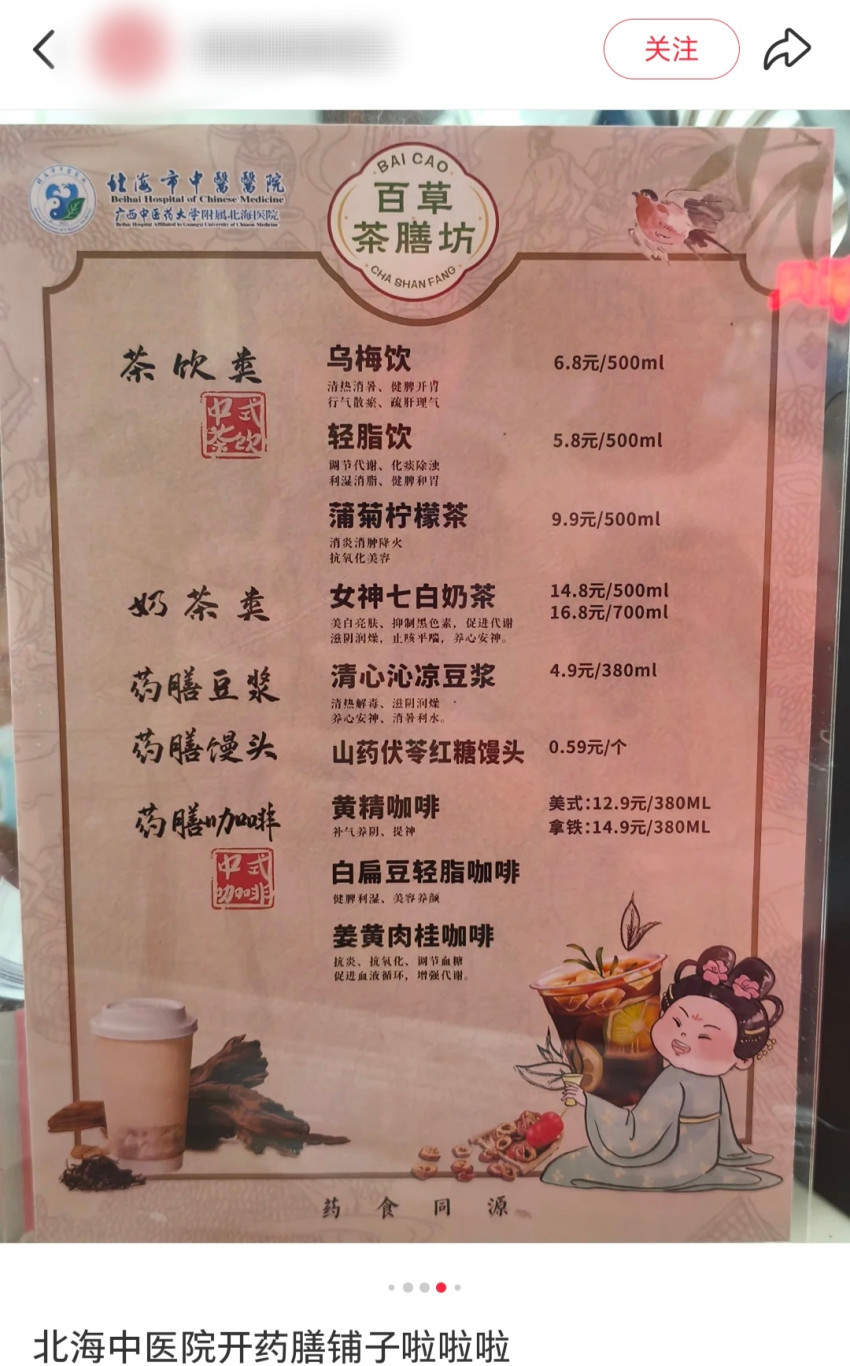 比如北海市中醫院,就開了一家“中醫院開的藥膳鋪子”,鋪子銷售的產品涵蓋藥膳類的茶飲、豆漿、咖啡等產品,產品售價在4.9-14.9元不等。產品甚至還因與中藥結合,被標註着美白亮膚、止咳平喘等功效,因此還吸引了不少年輕人消費打卡。