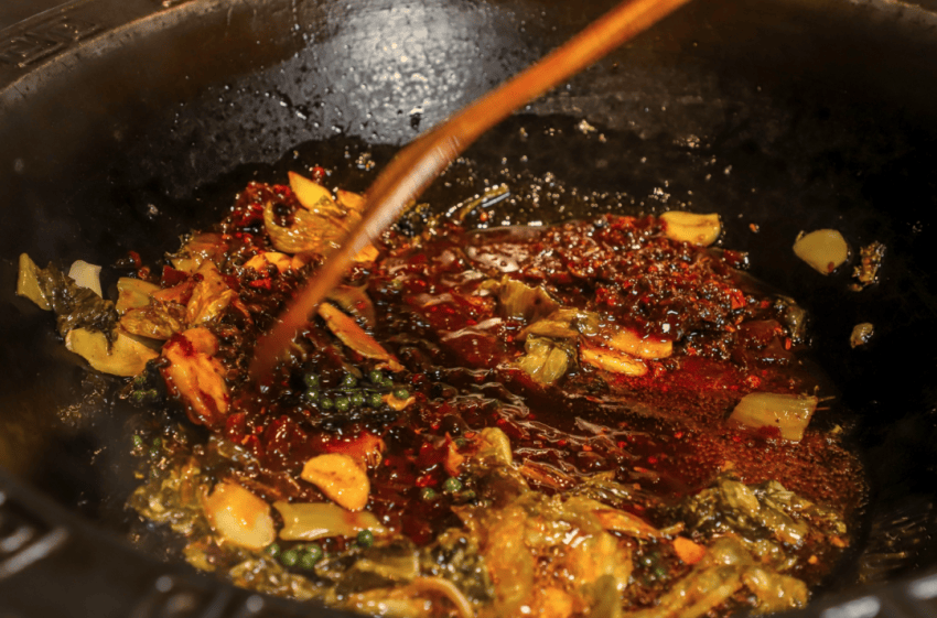 以底料標準為例,老船舫從選材就定下規矩:使用非轉基因一級菜籽色拉油、郫縣鵑城牌一級豆瓣醬;青花椒麻度≥27,紅花椒麻度要≥35等。