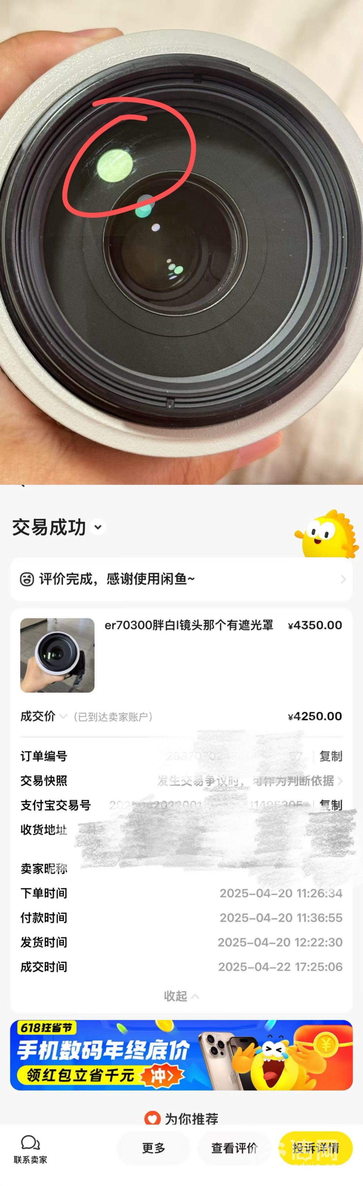 4月20日,王先生在閒魚平台上買了一個二手的佳能單反鏡頭,型號是EF 70-300 f4-5.6L。下單前,王先生看過賣家拍的鏡頭照片,也私信過對方鏡頭是否有問題,得到了滿意的答覆後就通過平台支付了4250元。