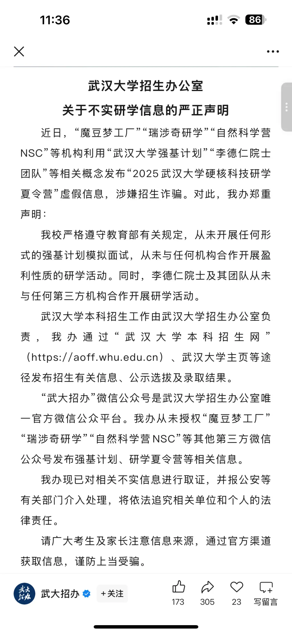 此外,6月11日,武漢大學招生辦公室發佈聲明:武漢大學嚴格遵守教育部有關規定,從未開展任何形式的強基計劃模擬面試,從未與任何機構合作開展營利性質的研學活動。同時,李德仁院士及其團隊從未與任何第三方機構合作開展研學活動。