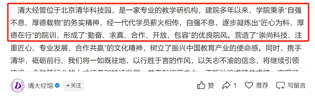 在“清大經館”公眾號2021年6月的一篇發文中提到,清大經管位於北京清華科技園,是一家專業的教學研機構……學院秉承“自強不息、厚德載物”的務實精神……逐步凝鍊出“匠心為科、厚德在行”的院訓。