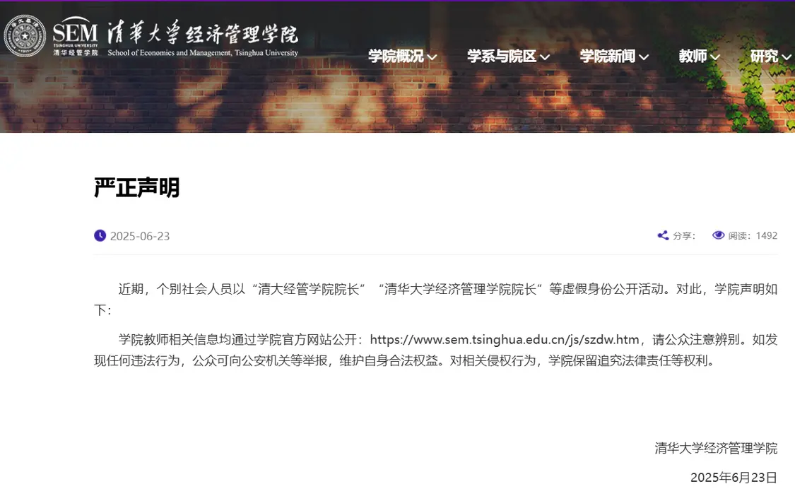 6月23日,清華大學經濟管理學院發佈聲明稱,個別社會人員以“清大經管學院院長”“清華大學經濟管理學院院長”等虛假身份公開活動。