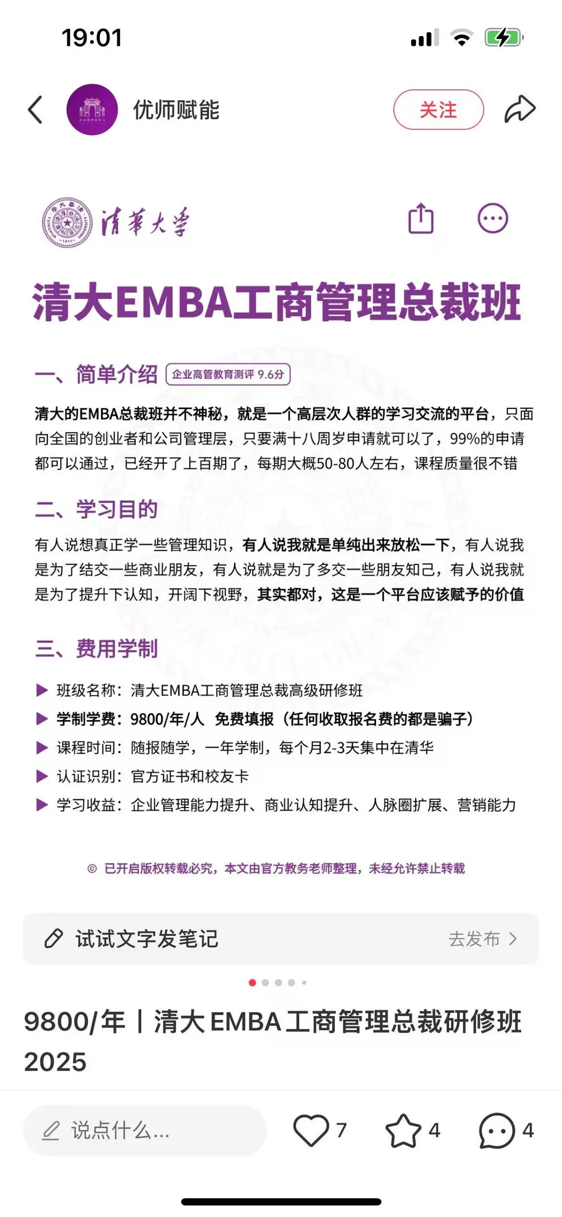 小紅書博主“優師賦能”今年4月發佈了一則“清大EMBA工商管理總裁班”的招生,文字顏色是“清華紫”、宣傳圖片左上角是清華大學校徽及字樣。發稿前,該博文已經刪除。