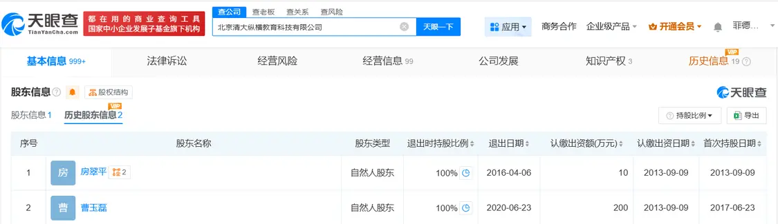 天眼查顯示,“清大經管”品牌所有人為北京清大縱橫教育科技有限公司(以下簡稱“清大縱橫”),清大縱橫註冊於2013年9月9日,現股東為自然人王玉,曹玉磊曾持股後於2020年6月退出。
