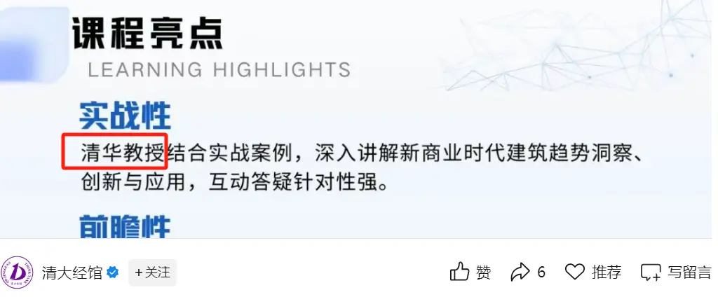 據“清大經館”微信公眾號發佈的文章,5月23日-25日,“清大經管”“高級工商管理建築業總裁研修班”開班。對於本次研修的授課人員,“清大經管”的介紹顯示,清華經濟學家+國防戰略專家+AI商業應用領軍者。介紹還提到,清華教授結合實戰案例講解新商業時代建築趨勢洞察……。