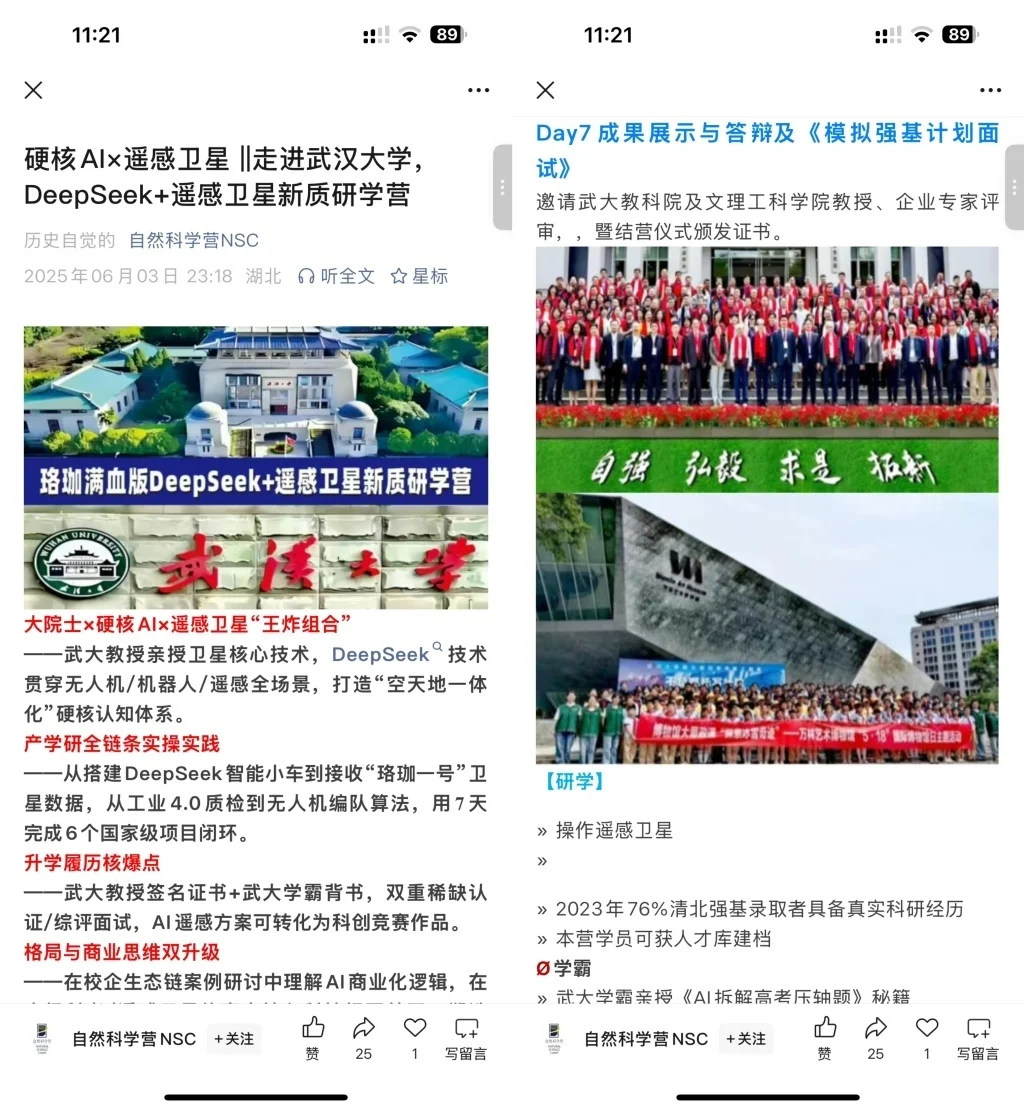 武漢大學發佈聲明背後是,“魔豆夢工廠”“瑞涉奇研學”等機構利用“武漢大學強基計劃”“李德仁院士團隊”等相關概念發佈“2025武漢大學硬核科技研學夏令營”,宣稱“武大教授親授衞星核心技術,7天完成6個國家級項目閉環”;“武大教授簽名證書+武大學霸背書,雙重稀缺認證/綜評面試,AI遙感方案可轉化為科創競賽作品”等。