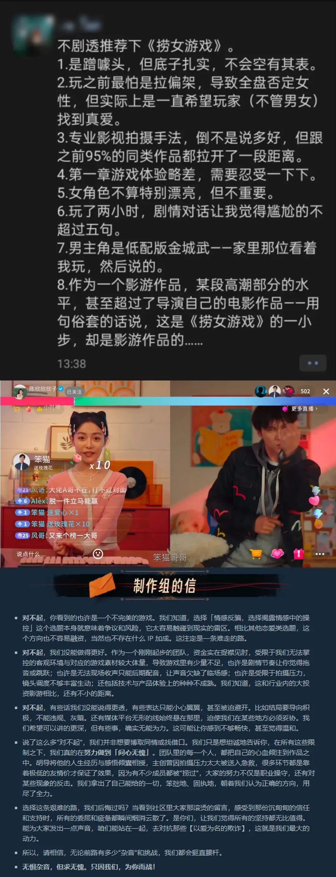 甚至於當這款遊戲相關視頻評論區的底下,這一情況也在愈演愈烈。不論是否與這款遊戲本身有關,但話題的討論已經上升到了男女對立之上,對於遊戲的爭議,一位資深遊戲人發朋友圈感慨:遊戲確實是蹭噱頭,但底子紮實,不是空有其表,遊戲某段高潮“可能超越了導演自己的電影”。製作組深知選題爭議重重,但玩家的信任與支持,他們渴望與玩家並肩,共同對抗那些“以愛為名的傷害”。