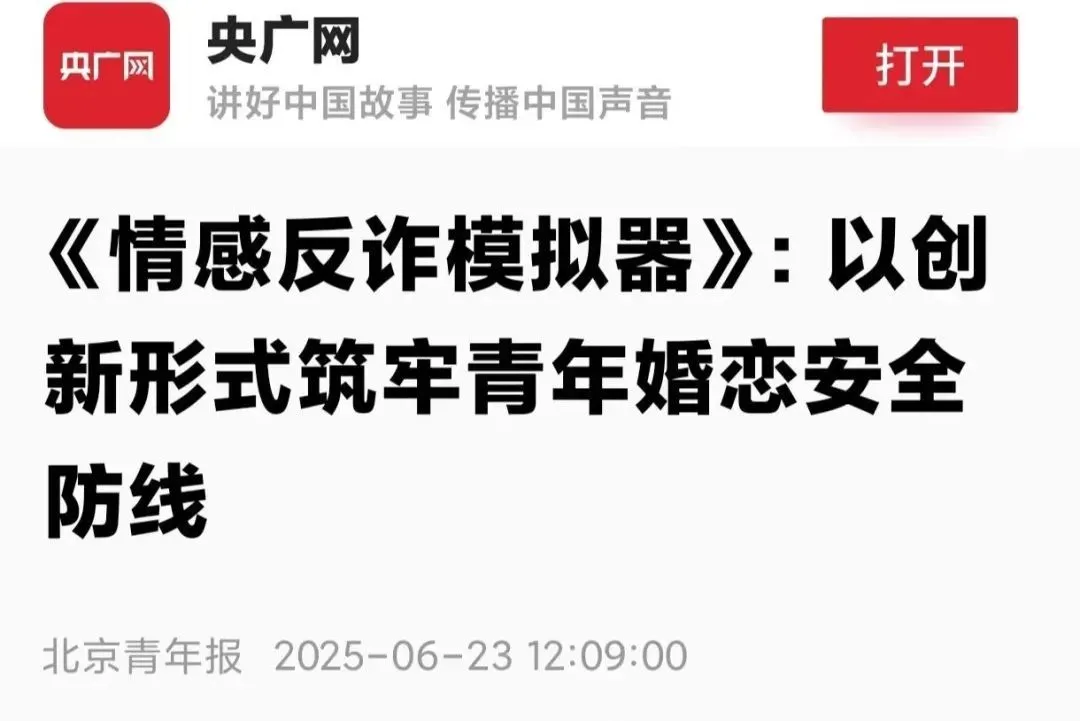 但就連咱們權威的中央廣播電視總枱也在6月23號發出文章(原作者:北京青年報),表揚了這款《情感反詐模擬器》。其表示:這款遊戲以創新形式築牢青年婚戀安全防線,將遊戲打造成了一場生動深刻的公開課。