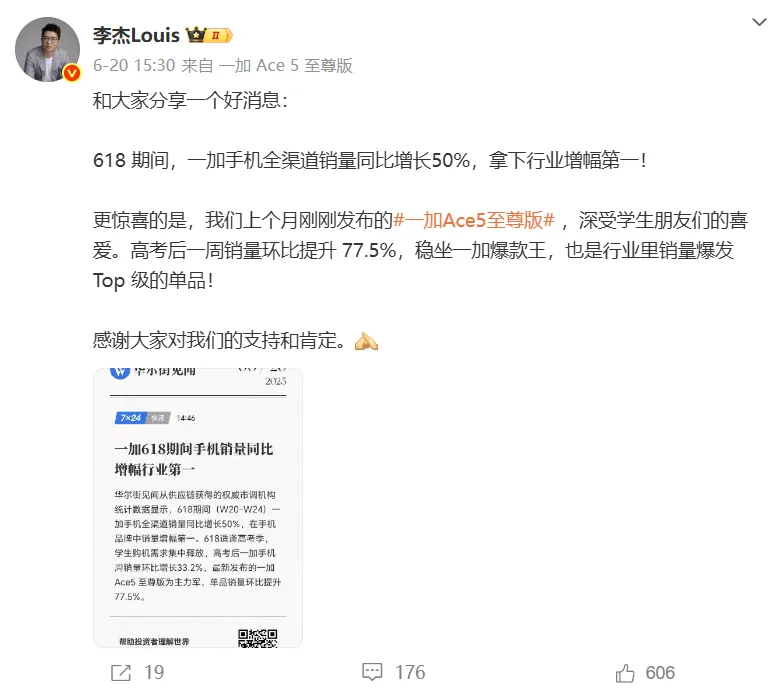 一加總裁李傑也在微博發佈捷報稱,“5月底剛發佈的一加Ace5至尊版深受學生朋友們的喜歡,高考後一週銷量環比提升77.5%,穩坐一加爆款王,也是行業裏銷量爆發Top級產品。”