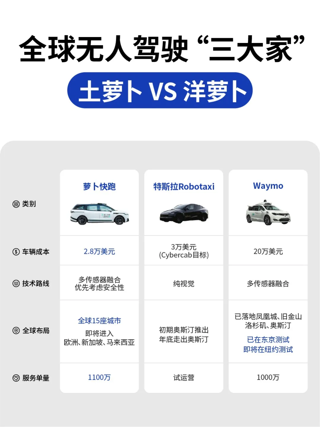 隨着特斯拉Robotaxi的試運營,全球無人駕駛“三大家”的格局也正式形成。不過,在這場關乎無人駕駛、人工智能的國運之爭中,暫時領先的蘿蔔快跑需要面對特斯拉和Waymo兩大巨頭的攻勢。