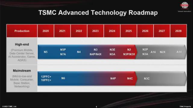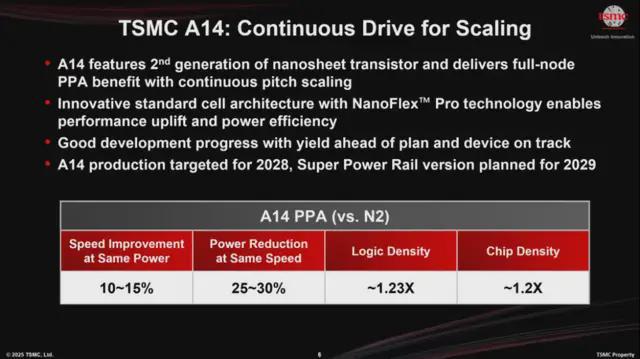 預定於2028年開始量產的“A14”製程將採用新技術“NanoFlex Pro”,與N2相比,邏輯密度將提升20%以上,每瓦計算速度將提升高達15%,預計將增強智能手機的AI功能。