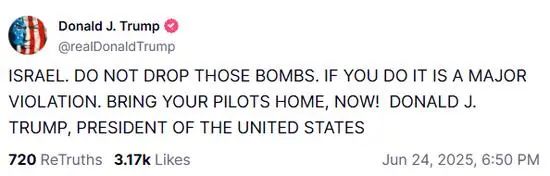 特朗普在社交媒體發文稱,“以色列,不要投那些炸彈。如果這樣做,那就是嚴重違規行為。讓你們的飛行員回家!馬上!”(圖源:特朗普社交賬號)