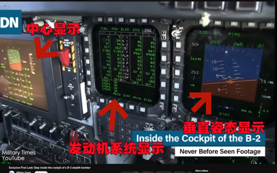 視頻中,B-2兩名飛行員面前仍然是四塊顯示器,分別顯示垂直、水平、飛控、發動機等數據。兩人中間有一塊大尺寸顯示屏,上面同樣有垂直姿態和發動機運行數據顯示。