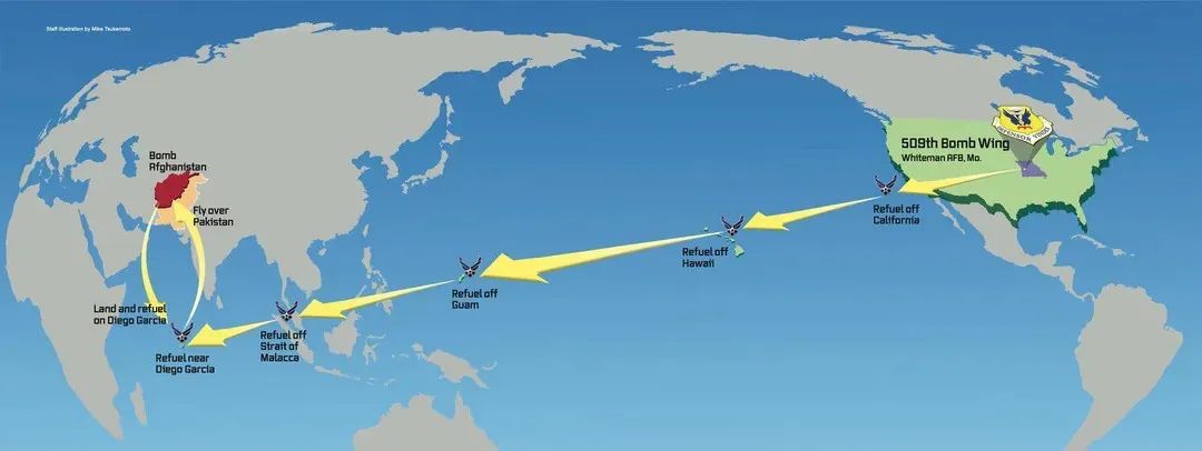 這是一場連續飛行36小時,橫越10個時區,中途多次空中加油,總距離2.4萬公里的超遠程轟炸,這是B-2服役以來最遠的一次轟炸。