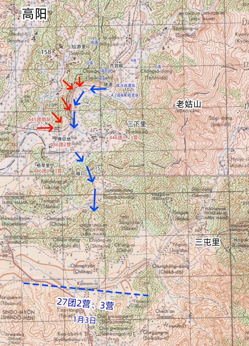當聯軍各部開始撤退時,志願軍已經開始磨刀霍霍向豬羊了。前出到高陽附近的149師師長金振中於1951年1月3日17時召集各團團⻓部署了夜間殲敵的具體作戰任務,他根據偵察獲得的敵情及地形情況,命令445團沿木巖裏、唐清裏向195.3高地攻擊前進;446團向上山、越川方向攻擊前進,搶佔附近要點,斷敵退路;447團師第二梯隊,在大慈山、霍山裏隱蔽待命,師指揮所前出到高陽附近。在19時30分。445團分別率先穿插到仙遊裏南127高地,第1營直插佛彌地、三下里,準備截擊英軍。446團2營也同時插到佛彌地,佔領有利地形,另外兩個營也在南至梧琴裏以東高地,北至佛彌地、三下里近2平方公里地區內展開。