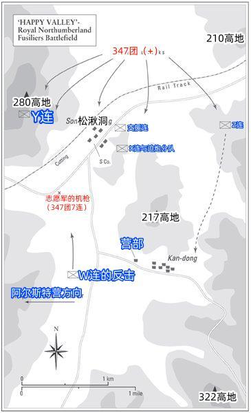 那麼究竟是怎麼回事呢?1月2日諾森伯蘭營抵達釜谷里後,以Y連佔據280高地,X連駐守松湫洞(該村和釜谷里相距甚近)約50英尺高的低矮山丘;Z連駐守松湫洞東邊的另一座山丘;支援連駐紮在村莊裏;營指揮部位於X連和Z連南側約1200碼的地方,在217高地南坡腳下。從抵達戰場開始,諾森伯蘭營的官兵就開始加強防禦工事,同時進行巡邏,347團偵察發現的“敵除佔領過去構築的零星工事和鐵絲網外,未發現新構築的工事和障礙”也是錯誤的。