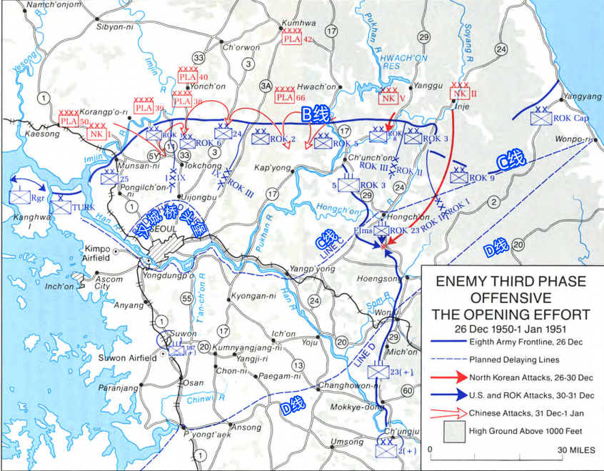 按照李奇微的命令,西線的美1軍和美9軍將向被稱為“漢城橋頭堡”的非堅守的防線撤退。漢城橋頭堡又向東延伸出一條經過楊平-洪川至東海岸的元浦裏的戰線,這條戰線被命名為C線,而韓第3軍團和第1軍團則向這條戰線撤退。