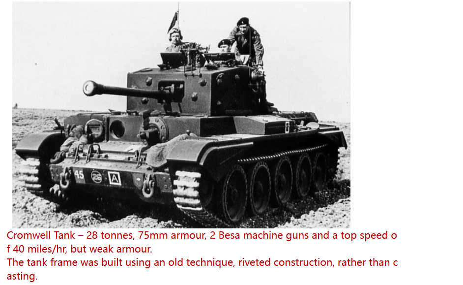克倫威爾輕型坦克重為28噸,裝備75毫米主炮和2挺Besa車載機槍。該型坦克最高時速為40英里/小時。儘管克倫威爾坦克的裝甲較為薄弱只有75毫米,但其輕巧的特點使其相比於新式的百夫長坦克更適合在漢江以北的稻田和公路作戰。