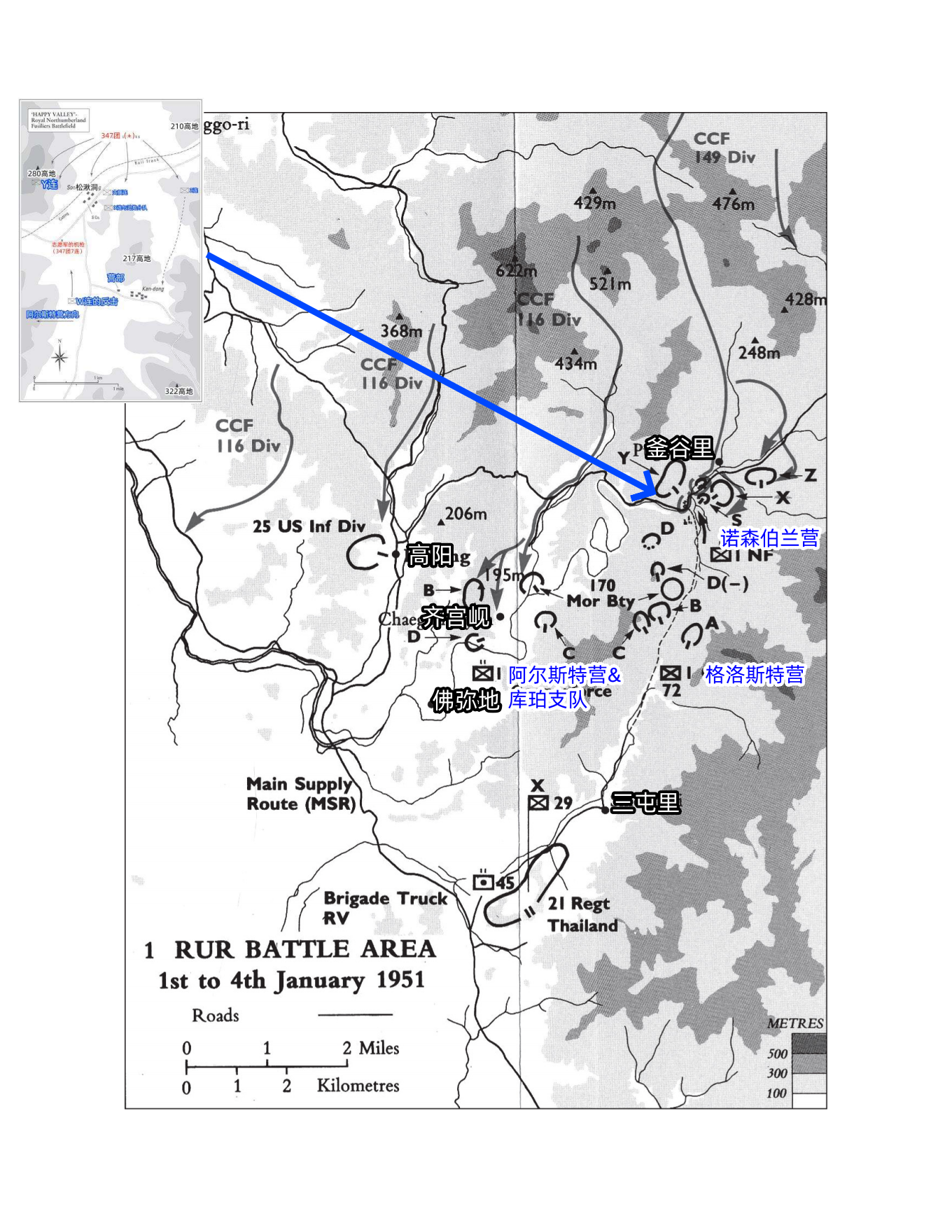 在29旅的車輛駛入雪覆蓋的稻田,士兵們跋涉着登上冰冷的山脊的幾個小時後,116師347團於3日凌晨3時30分進至釜谷上裏,他們面前的正好是諾森伯蘭營。志願軍發現西南約兩公里處的釜谷里方向有汽車發動聲和燈光的閃亮,團即令部隊停止前進。據116師師史記載:“經向當地居民瞭解,得知2日夜由議政府方向退下來英軍約400餘人,汽車30餘輛,佔領釜谷里學校及周圍高地。”然而在1988年由軍史編寫辦公室編寫的《中國人民解放軍陸軍第三十九集團軍軍史——抗美援朝時期(徵求意見稿)》卻打了前者的臉,批評“由於三四七團沒有很好地偵察敵情,僅據民稱“該地有敵200餘””。
