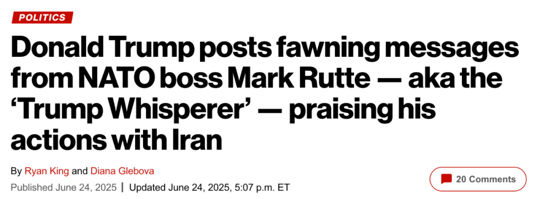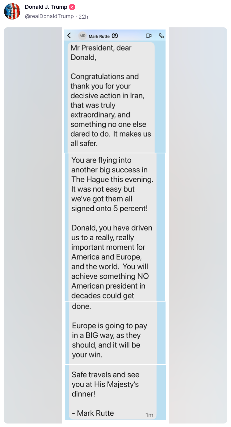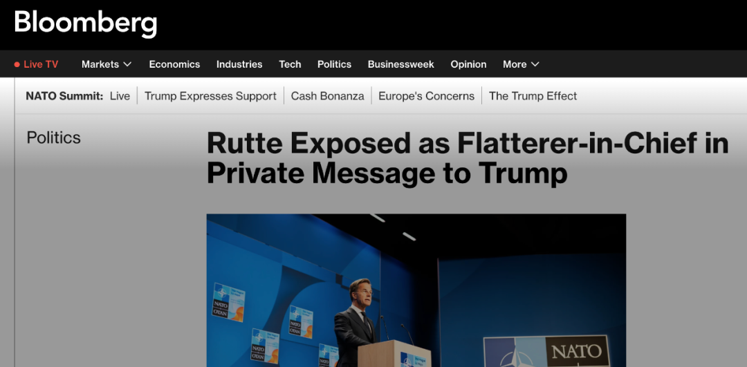 最後一句讚美也最誇張:“您帶領大家走向了對美國、對歐洲乃至對全世界都至關重要的時刻。您將實現數十年來任何一位美國總統都無法企及的成就。歐洲將做出巨大的付出——他們理應如此,這將是您的勝利。祝您平安到達海牙,我們在國王設的晚宴上見!”