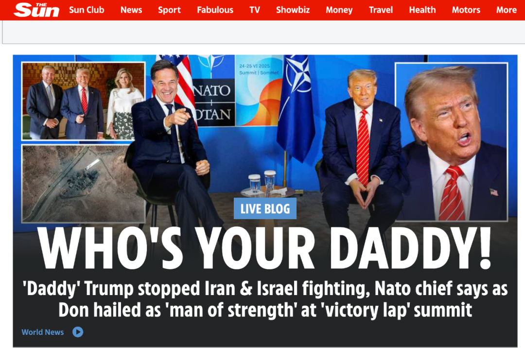 這樣的稱呼,也成為了今日英媒的頭條,其中太陽報頭條以“WHO’S YOUR DADDY!(爸爸來了,誰敢不服!)”為題,用這種英語口語中常見的誇張表達,來形容當時特朗普與呂特,以及與峯會其他領導人之間的關係。