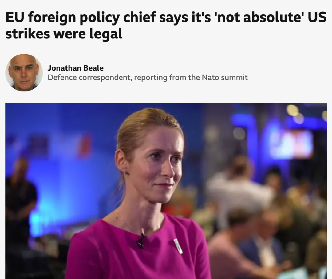 但英媒指出,雖然本次峯會目前看着很和諧,但有關中東衝突的話題仍然充滿爭議,比如,歐盟外交政策負責人卡拉斯今天就公開質疑了美國對伊朗打擊的合法性,她表示:“所有使用武力的人必須證明其符合國際法。” 但被問及美國打擊是否合法時,她回應稱:“這並非絕對合法”。