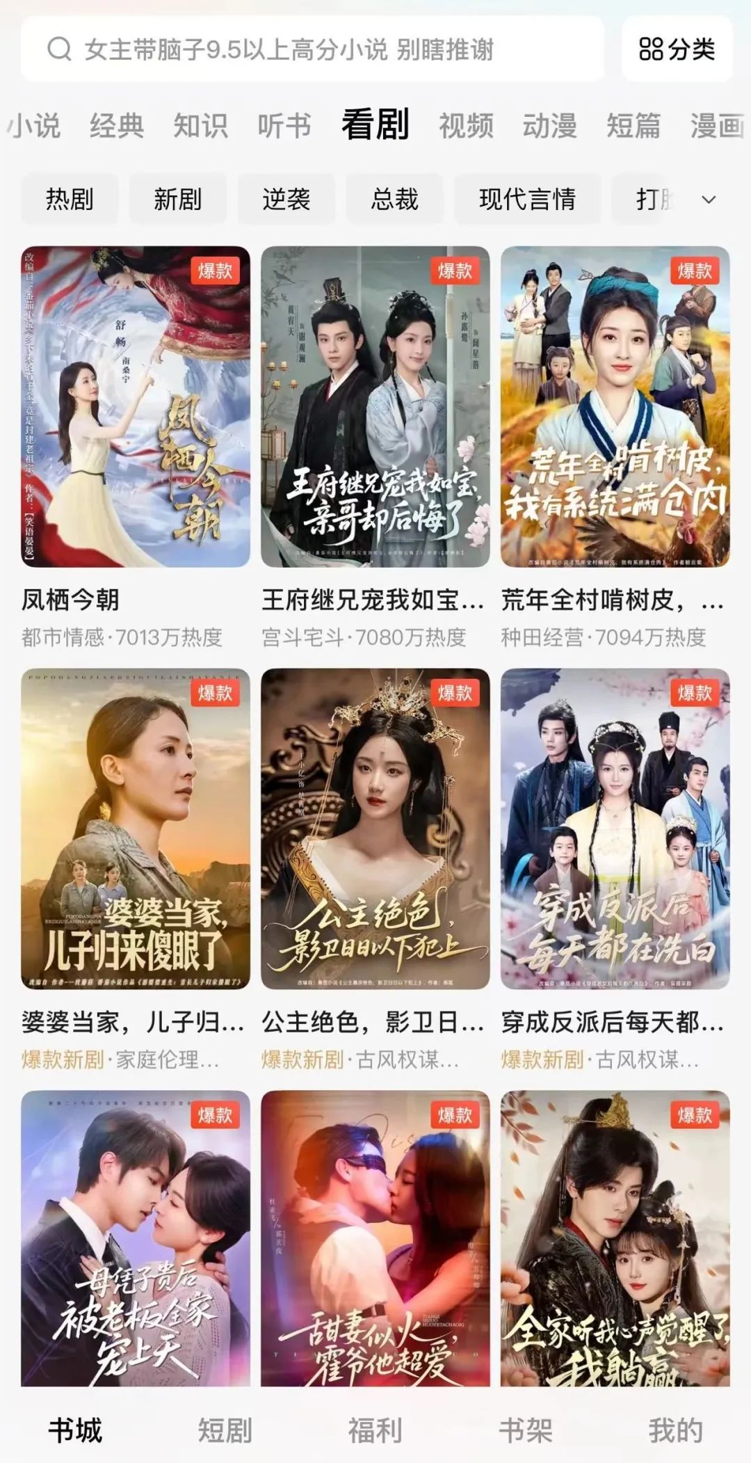 打開番茄小説界面,文娛價值官看到首頁除了小説、聽書等常規欄目,站內的“看劇”欄目格外搶眼。點擊進“看劇”,作品按時代背景、角色設定、主題情節、性別、集數進行分類,用户得以快速鎖定自己的喜好風格。這些短劇作品不少來自番茄小説的網文改編,強衝突、快節奏的短篇網文是短劇的內容源頭,而文字讀累了直接看短劇更符合當下用户的娛樂需求。