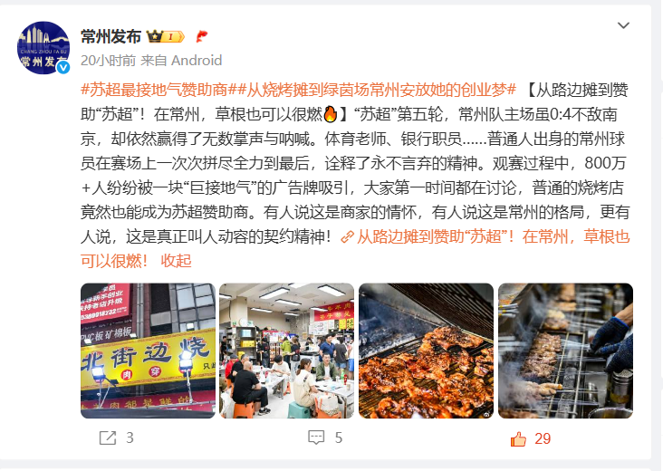本着打不過就加入的原則,常州官方微博三天發佈六條“蘇超”系列視頻,播放量達160萬+,飆歌、對詩、家書、美食輪番上陣。