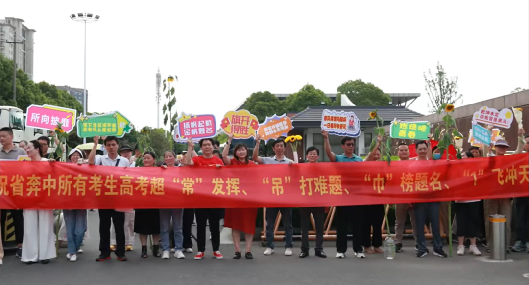 常州市民響應官方號召,在高考考點外拉起“超‘常’發揮、‘吊’打難題、‘巾’榜題名、‘丨’飛沖天”橫幅,直接把自嘲轉化為勵志符號。