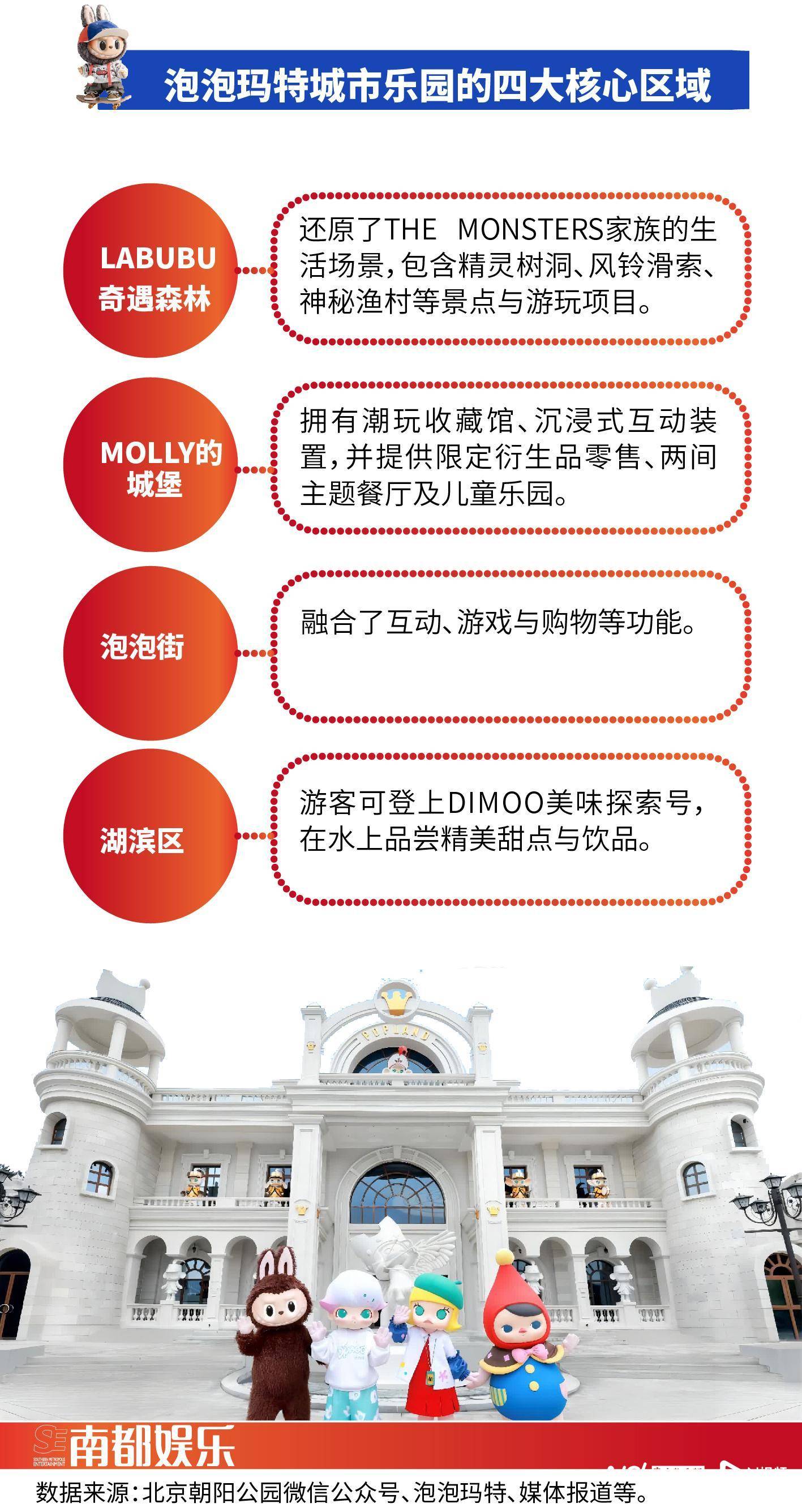 位於北京朝陽公園的泡泡瑪特城市樂園佔地面積約4萬平方米,於2023年9月26日開業,按照空間分為四大核心區域:融合了互動、遊戲與購物的泡泡街;還原了THE MONSTERS家族生活場景的森林區;遊客可登上DIMOO美味探索號,在水上品嚐精美甜點與飲品的湖濱區;以及樂園主建築——MOLLY的城堡。城堡內除了擁有潮玩收藏館、沉浸式互動裝置外,還提供限定衍生品零售、兩間主題餐廳及兒童樂園。