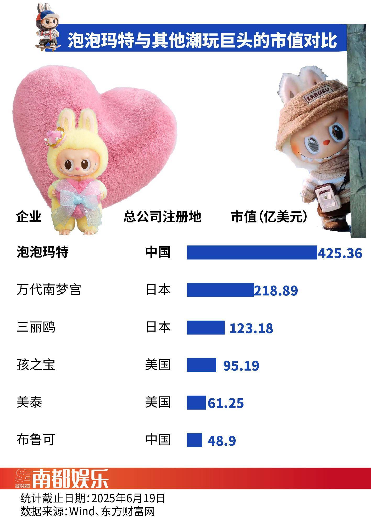 截至6月19日收市,泡泡瑪特的股價雖有所波動,但市值依然高達3338億港元,摺合約425.36億美元,雖然距離迪士尼的市值(約2111億美元)仍有差距,但已是日本玩具巨頭,擁有高達、太鼓達人等知名IP的萬代南夢宮的接近兩倍,更是三麗鷗的三倍多。此外,泡泡瑪特的市值更已超過美國潮玩巨頭孩之寶的四倍。