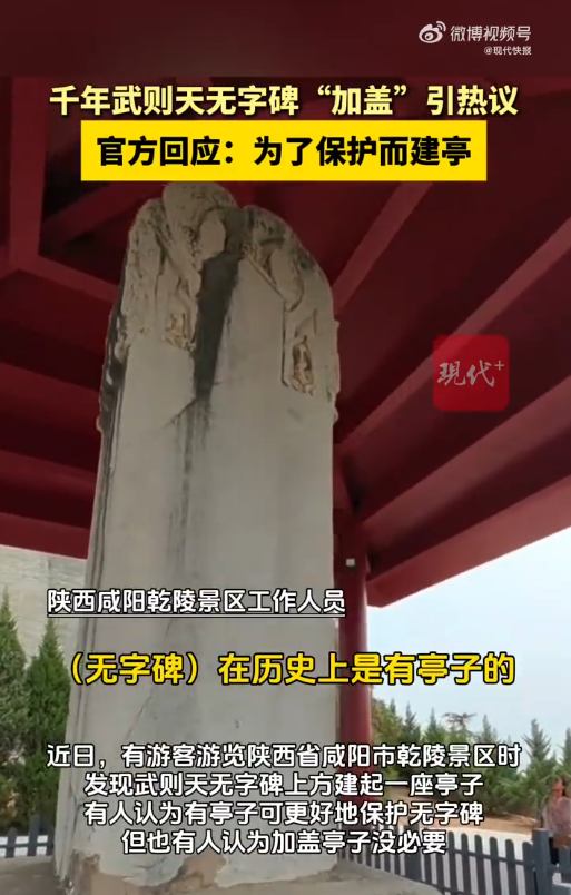 對此,陝西省咸陽市乾陵管理處工作人員告訴記者,這個亭子並非隨意加蓋,而是出於對無字碑的全面保護考慮而專門修建的。